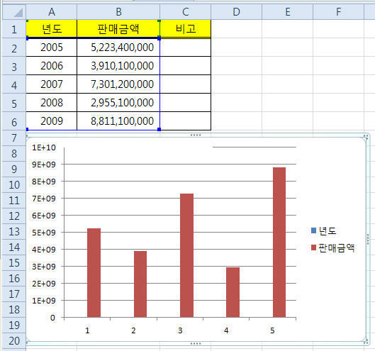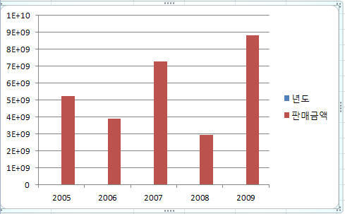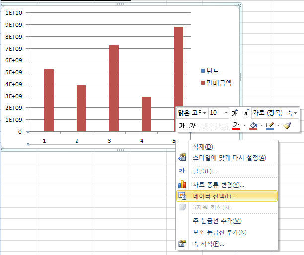 다음은 세로축(y축)의 값이 지수형태로 보기가 좋지 않은데 해당 축의 서식을 변경시키는 방법을 알아 보도록 하겠습니다.