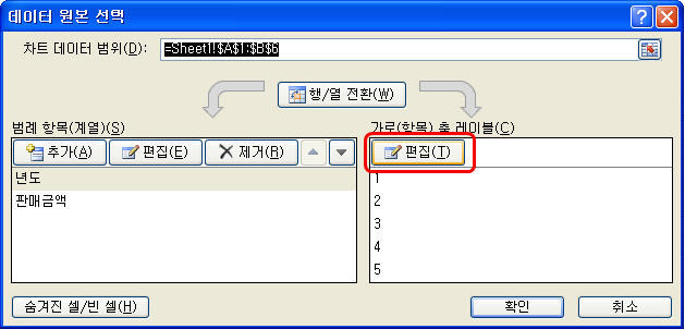 나타난 [데이터 원본 선택] 대화 상자에서 좌측 범례에 [년도]가 선택되어 있다면 [가로(항목) 축 레이블]에는 1,2,3,4,5가 나열되어 있을것입니다.