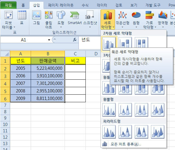 차트를 만들 범위인 [A1:B6]셀을 선택하고 [삽입] 탭 - [차트] 그룹 - [세로 막대형]에서 [묶은 세로 막대형]을 클릭해서 차트를 만듭니다.