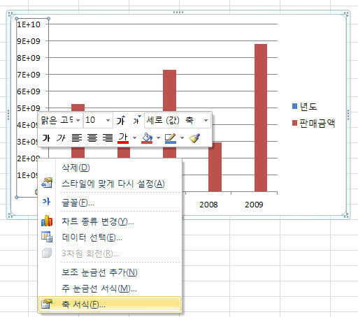 물론 세로축을 선택하지 않고 세로축을 바로 우측클릭해도 [축 서식]을 실행할 수 있습니다.