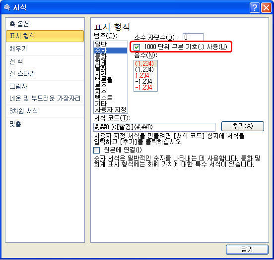 나타난 [축 서식] 대화 상자에서 [표시 형식] 부분에서 아래 그림과 같이 범주의 [숫자]를 선택하고 [1000 단위 구분 기호(,) 사용]에 체크를 하고 [확인] 버튼을 클릭합니다.