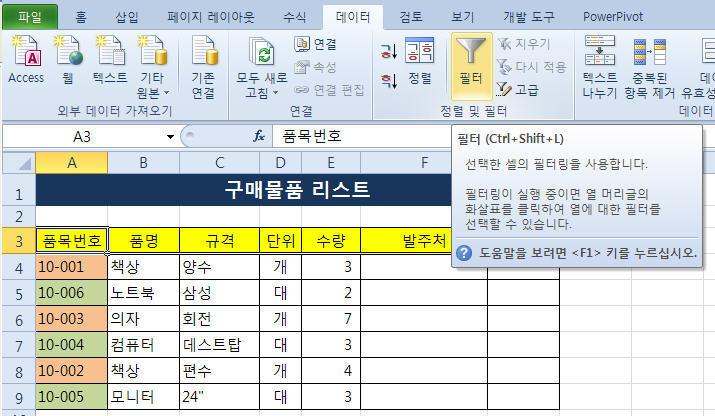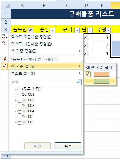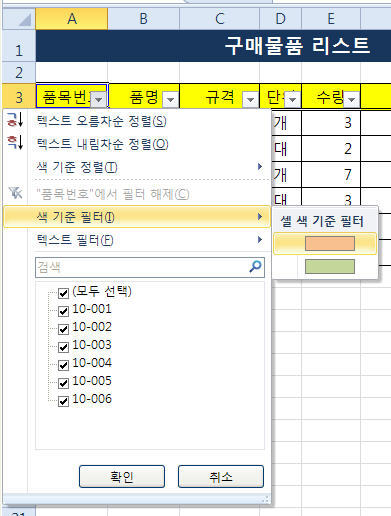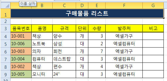 아래 그림에서 보는 바와 같이 품목번호에 있는 셀의 채우기색을 통해 사무용 가구와 컴퓨터관련 부품을 구분했습니다.