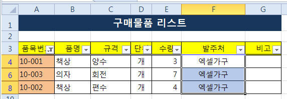필터링된 데이터의 발주처를 입력하기 위해 [F4]셀에 '엑셀가구'라고 입력후 [F8]셀까지 드래그 해서 값을 채웁니다.