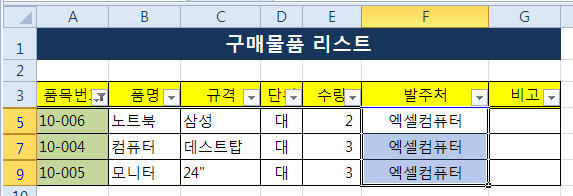 그런데 [F]열에 발주처에 가구는 '엑셀가구'에 컴퓨터는 '엑셀컴퓨터'에 발주하고자 할때 간단히 발주처를 입력할 수 있는 방법을 알아 보고자 합니다.