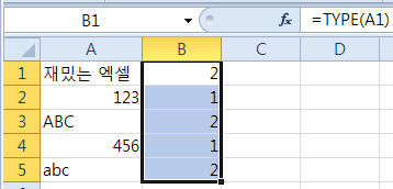 [A1:A5] 셀에 있는 데이터의 유형을 알아 보기 위해 [B1]셀에 =TYPE(A1) 으로 입력후 [B5]셀까지 드래그 합니다.