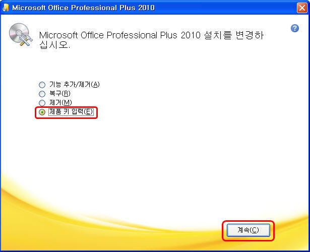 아래 대화상자가 나타나면 [제품 키 입력]을 선택후 [계속]버튼을 클릭합니다.