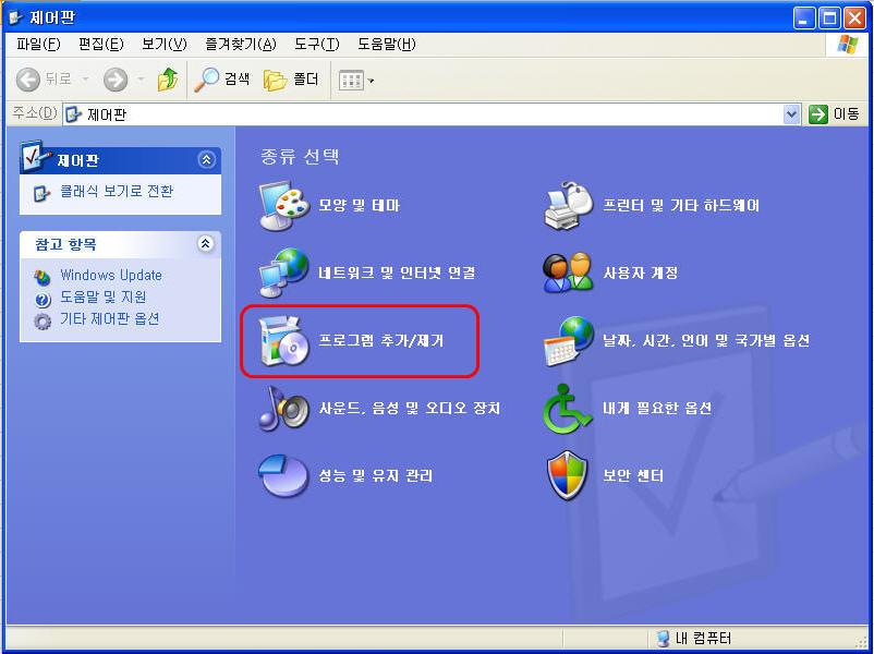 먼제 제어판을 실행하고 [프로그램 추가/제거]를 실행합니다.