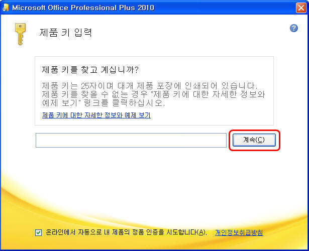 정확한 정품 제품 키를 입력하면 [계속] 버튼이 활성화 됩니다.
