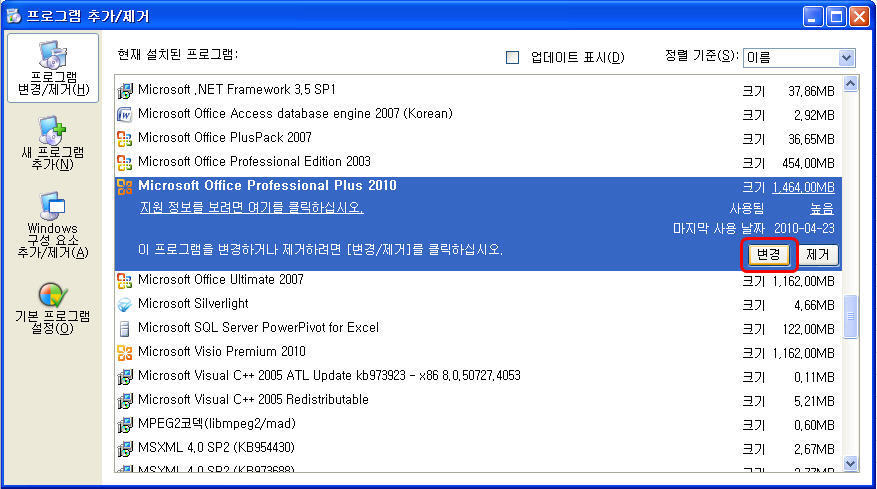 그리고 인스톨된 Microsoft Office 2010 을 선택하고 [변경]버튼을 클릭합니다.