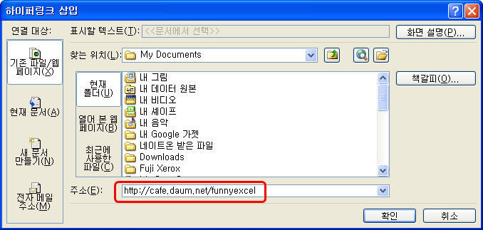 나타난 [하이퍼링크 삽입] 대화상자의 하단 [주소]부분에 [재밌는 엑셀]의 URL을 입력하고 [확인] 버튼을 클릭합니다.