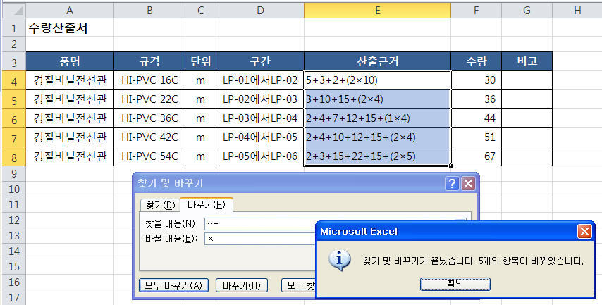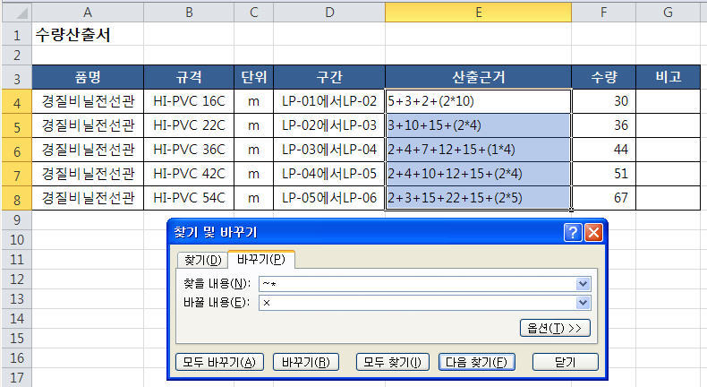 마찬가지로 *문자가 포함된 [E4:E8]셀을 선택하고 찾기 및 바꾸기를 실행합니다.
