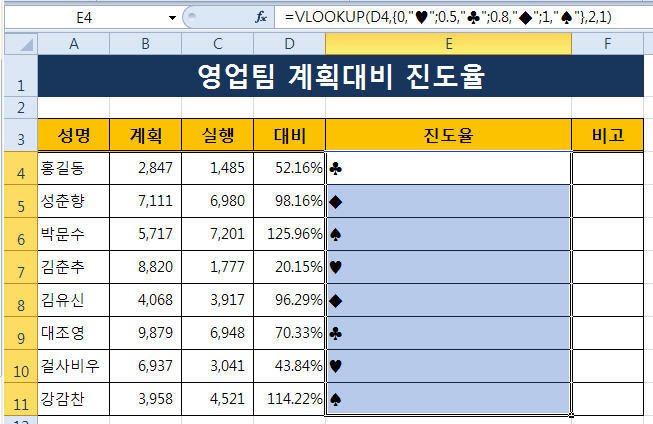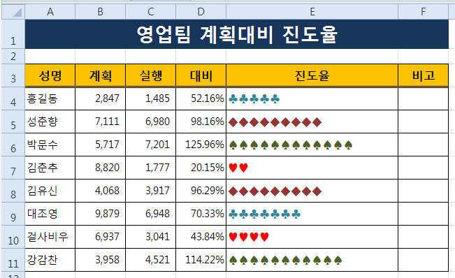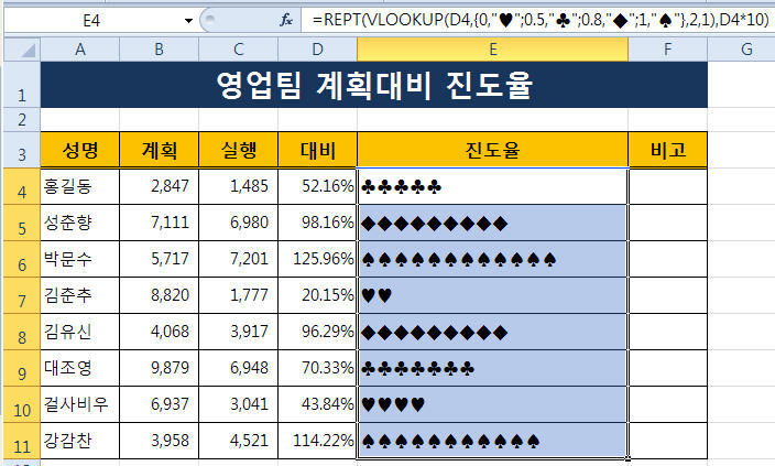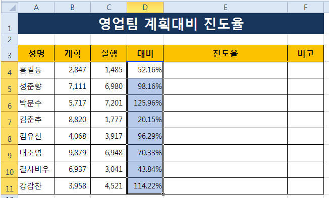 아래와 같이 영업팀의 영업계획 대비 실행의 대비율을 REPT함수를 이용해서 진도율을 나타내겠습니다.