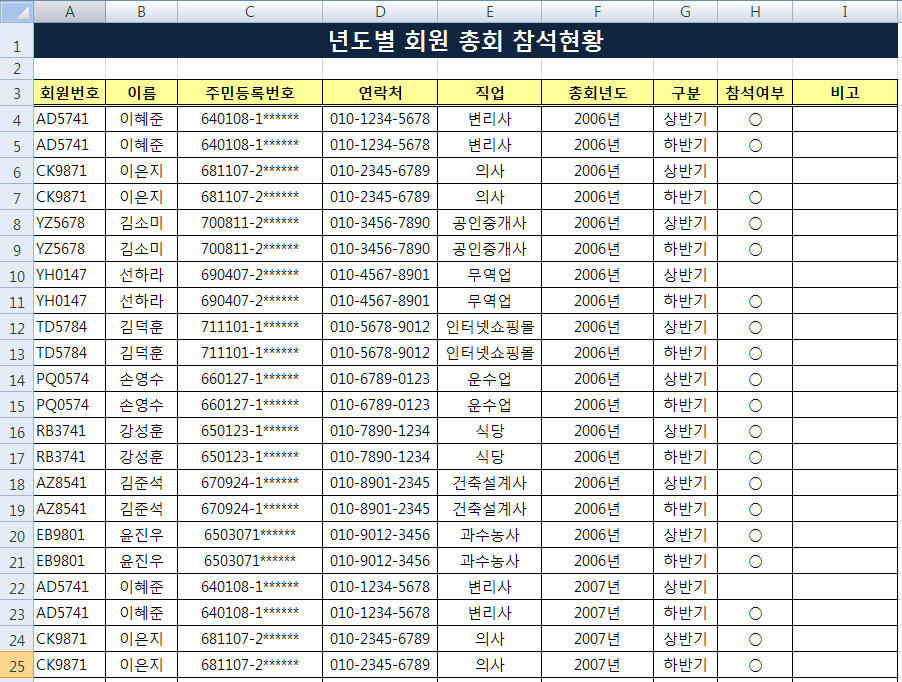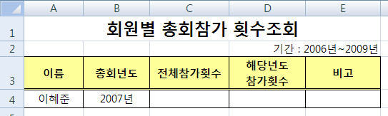 위의 데이터베이스를 이용해서 아래 그림과 같이 특정인의 전체 총회참가횟수를 알고자 하고 또 특정인의 특정년도의 참가횟수를 알고자 합니다.