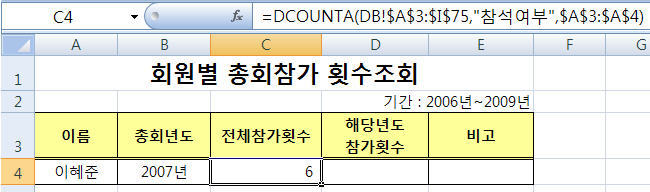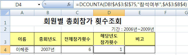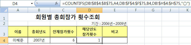 그렇다면 단일조건이 아닌 특정인의 특정년도의 참가횟수를 구하고자 한다면 [D4]셀에...