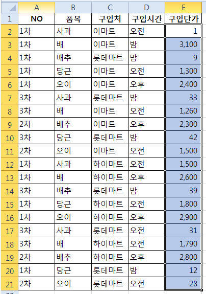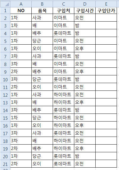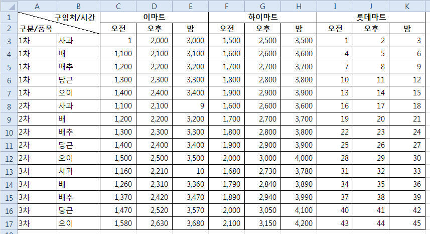 =OFFSET(가격표!$B$2,MATCH(B2,가격표!$B$3:$B$7,0)+(VALUE(SUBSTITUTE(A2,"차",""))-1)*5,MATCH(D2,가격표!$C$2:$E$2,0)+VLOOKUP(C2,{"이마트",0;"하이마트",3;"롯데마트",6},2,0))