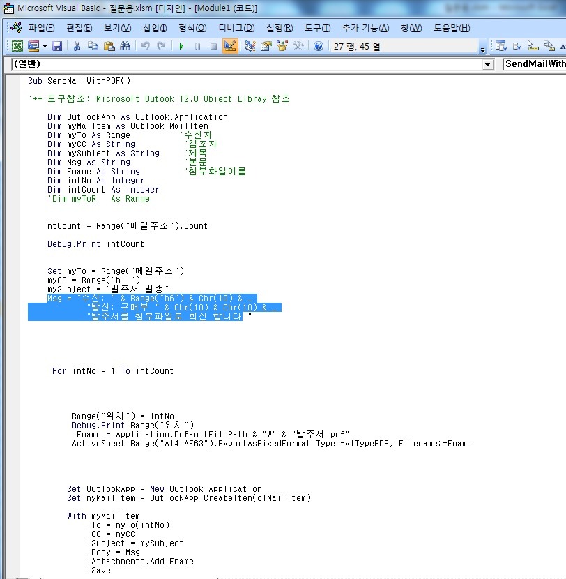 일단 "PDF메일전송" 시트에서 매크로 버튼 누르면