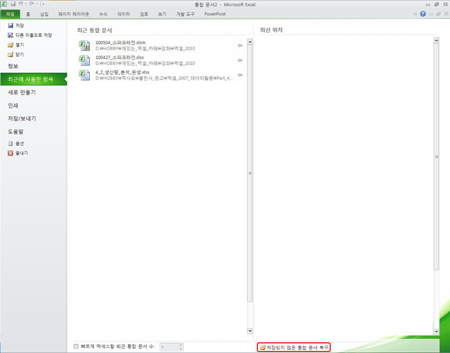 아래와 같이 Backstage 단추 [파일]-[최근에 사용한 항목]을 선택하고 하단의 [저장되지 않은 통합 문서 복구]를 클릭합니다.