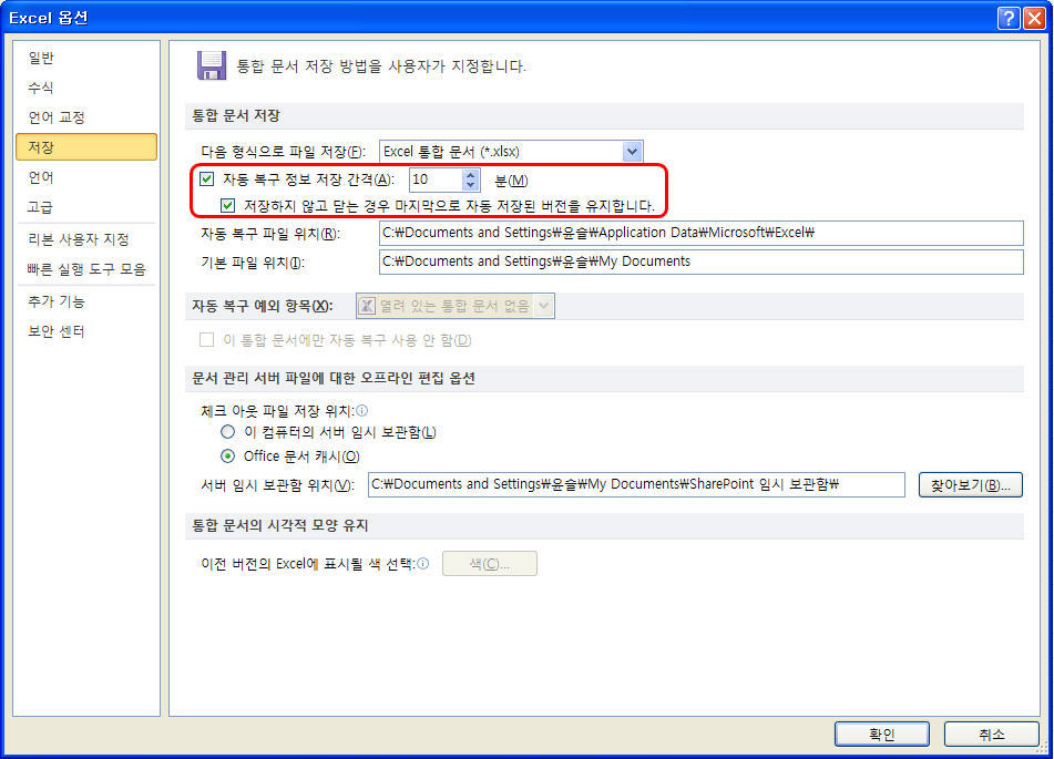 엑셀 2010은 자동 저장 기능이 향상되었습니다.
