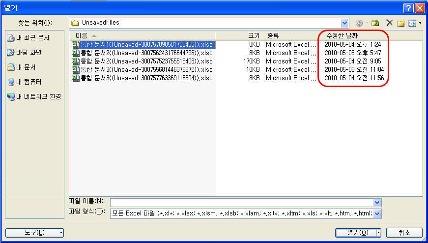 그리고 [열기] 대화 상자가 나타나면 수정한 날짜를 잘 살펴보고 해당 문서를 선택후 [열기] 버튼을 클릭합니다.