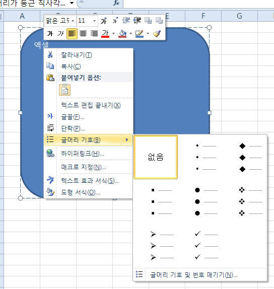 먼저 '엑셀'이라고 입력했습니다. 입력된 내용을 우측클릭해서 [글머리 기호]로 마우스 커서를 움직인 다음 적당한 [글머리 기호]를 선택합니다.