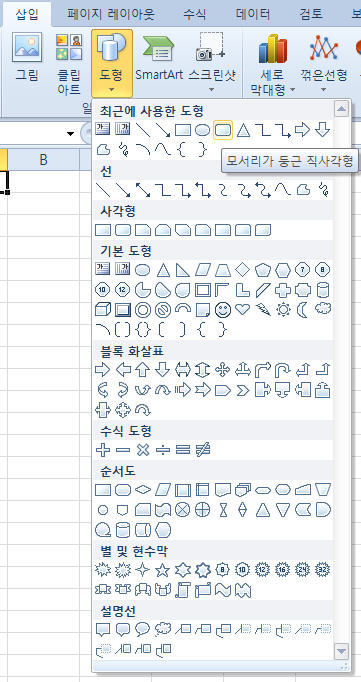 먼저 [삽입] 리본메뉴-[일러스트레이션] 그룹-[도형]에서 [모서리가 둥근 직사각형] 개체를 하나 시트에 추가합니다.