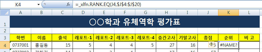 그래서 하위버젼에서 위와 같은 순위를 나타내고자 한다면 아래 그림과 같이 [K4]셀에...