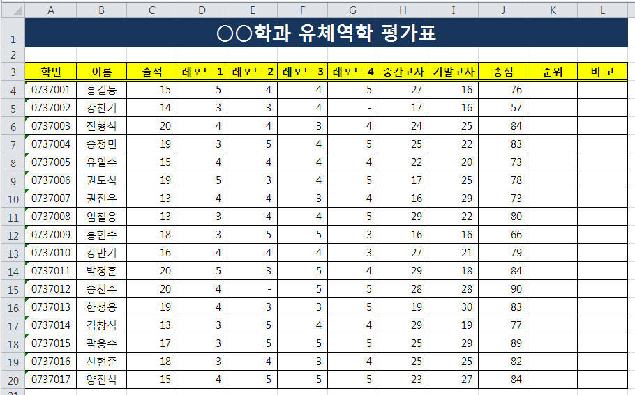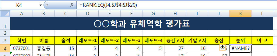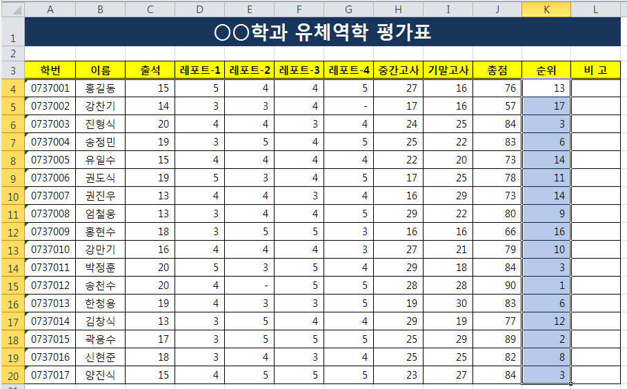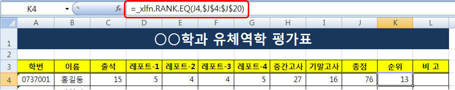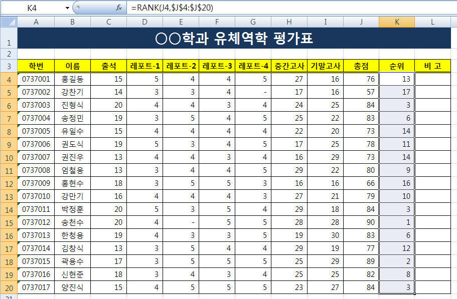 순위를 나타내기 위해 [K4]셀에 =RANK.EQ(J4,$J$4:$J$20) 로 입력후 아래로 드래그 했습니다.