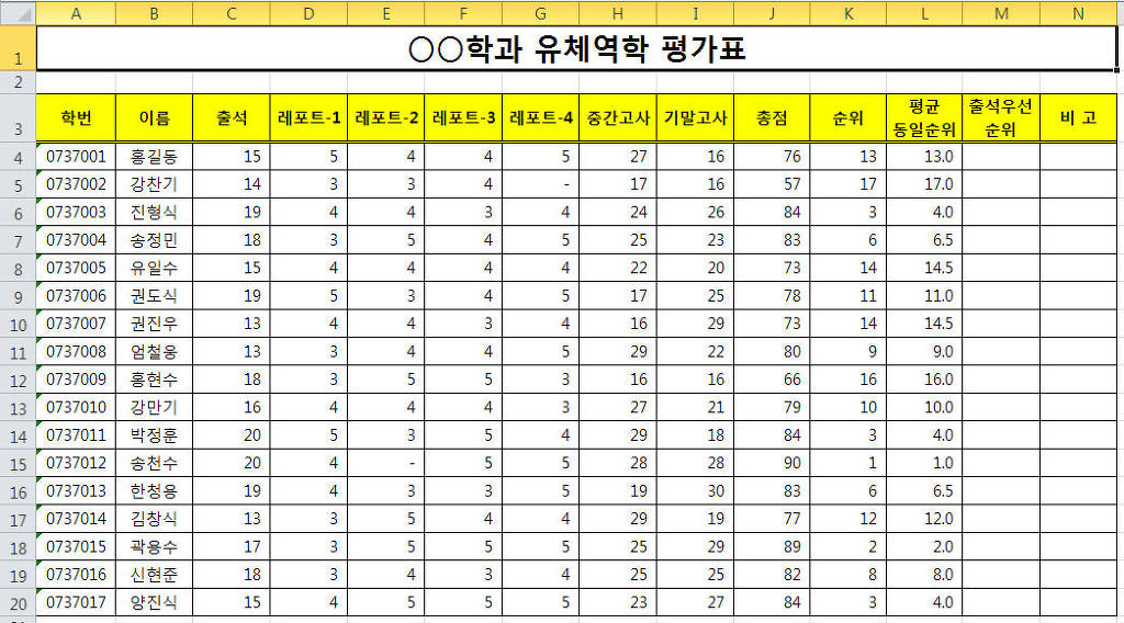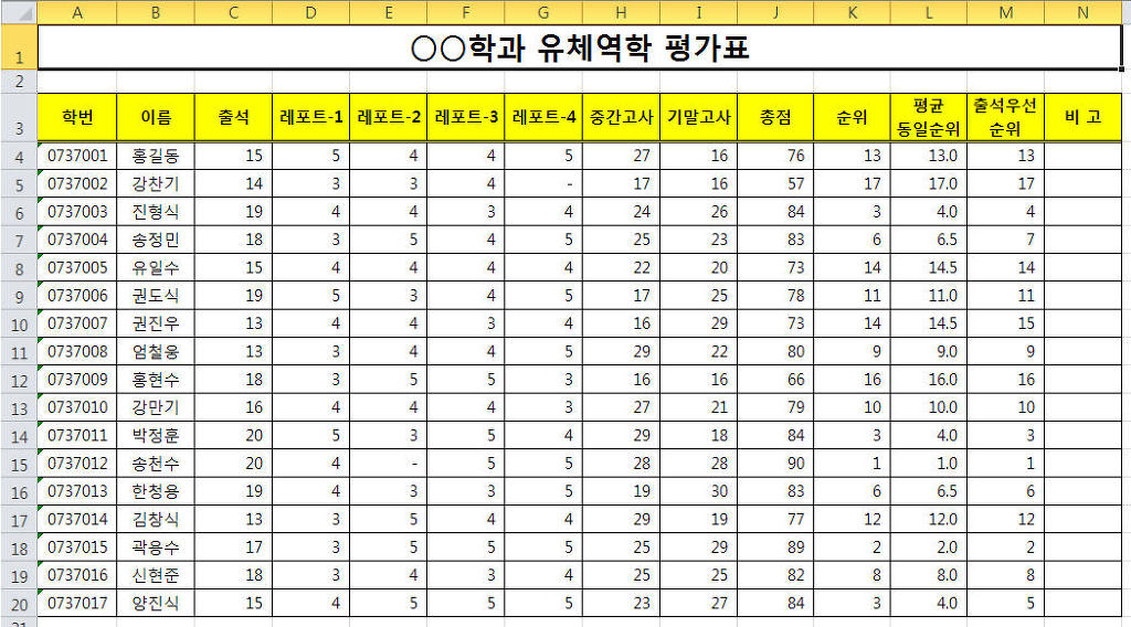 로 입력후 아래로 드래그 하면 동일점수에 대해 출석점수가 높은 사람의 등수가 높게 나타나겠죠.