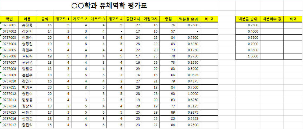 다시 말씀드려 아래 예제에서는 백분율 순위가 얼마일때 해당 백분율 순위에 해당하는 총점이 몇점인지를 나타내고자 한다는 것입니다.