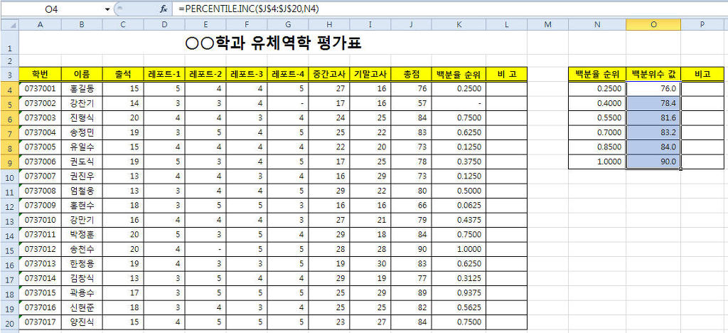 그렇다면 [O4]셀에는 [J4:J20]셀의 수중에 백분율 순위 [N4]값에 대응되는 값인 76이 나타나는 것입니다.