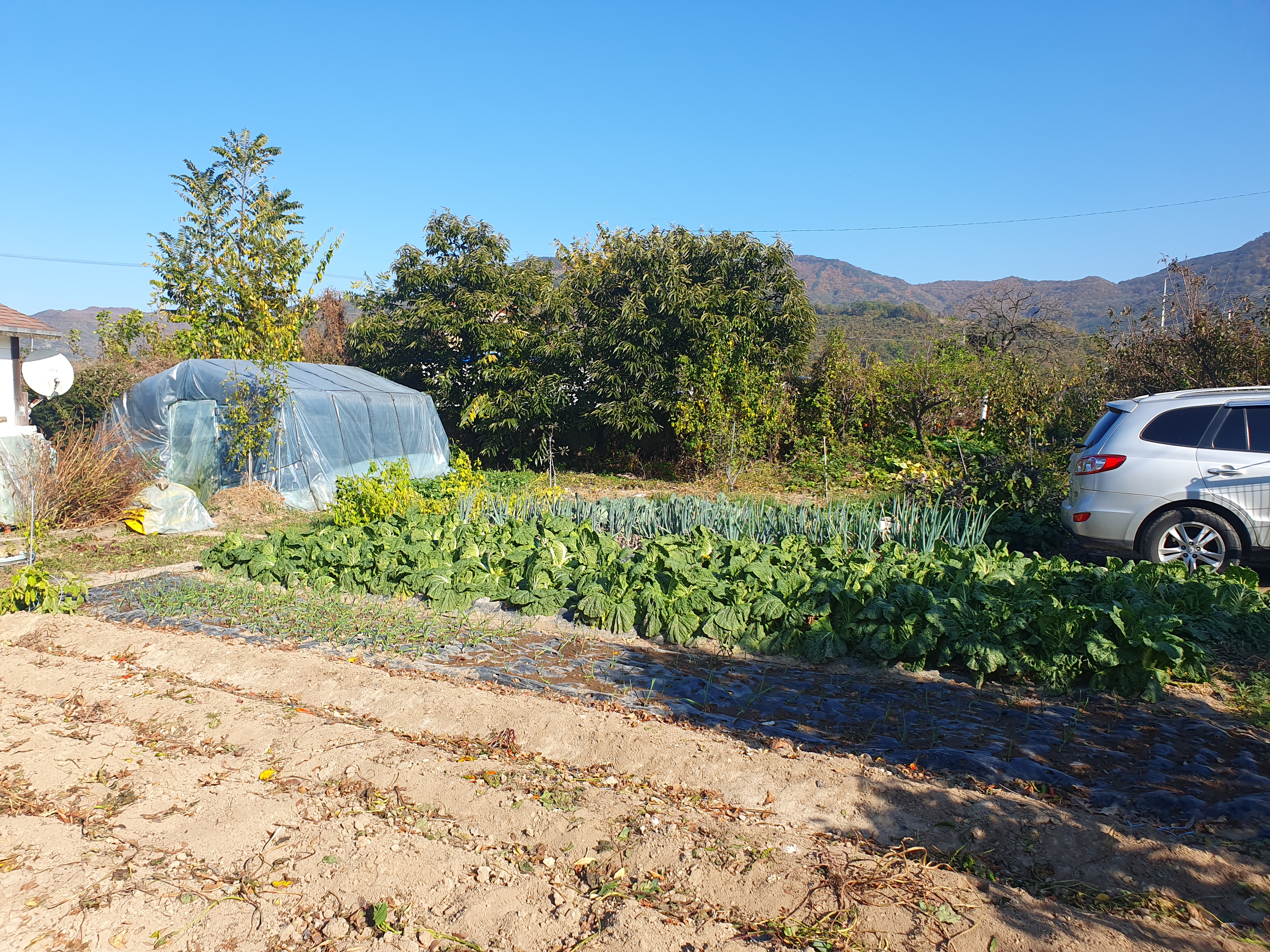 차를 주차하는 곳 부직포도 걷어 비닐하우스에