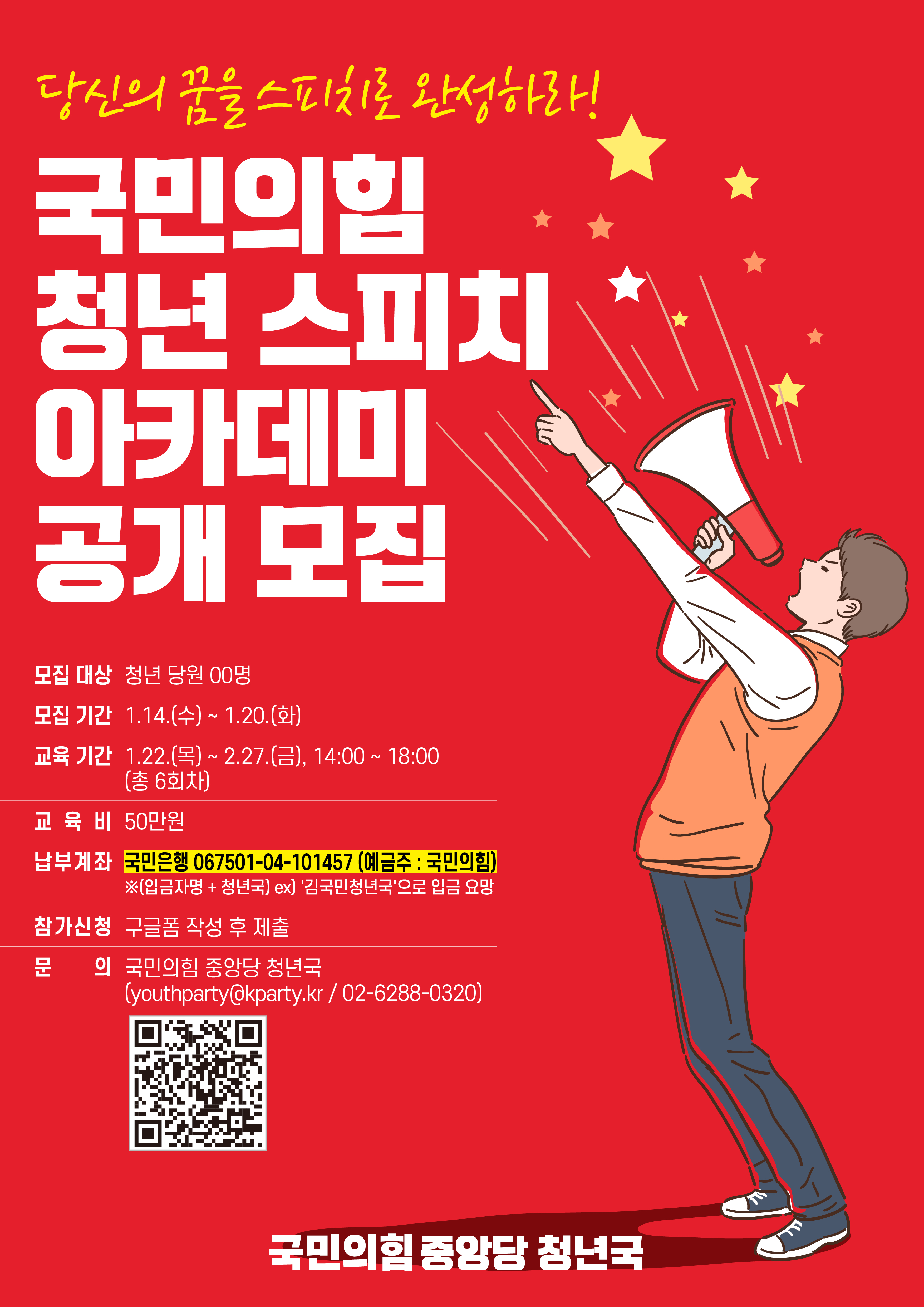 국민의힘 청년 스피치 아카데미 공개 모집 작성자국민의힘광주광역시당|작성시간26.01.16|조회수16 목록 댓글 0 글자크기 작게가 글자크기 크게가 다음검색 현재 게시글 추가 기능 열기 북마크 공유하기 신고 센터로 신고 댓글 댓글 0 댓글쓰기 댓글 리스트