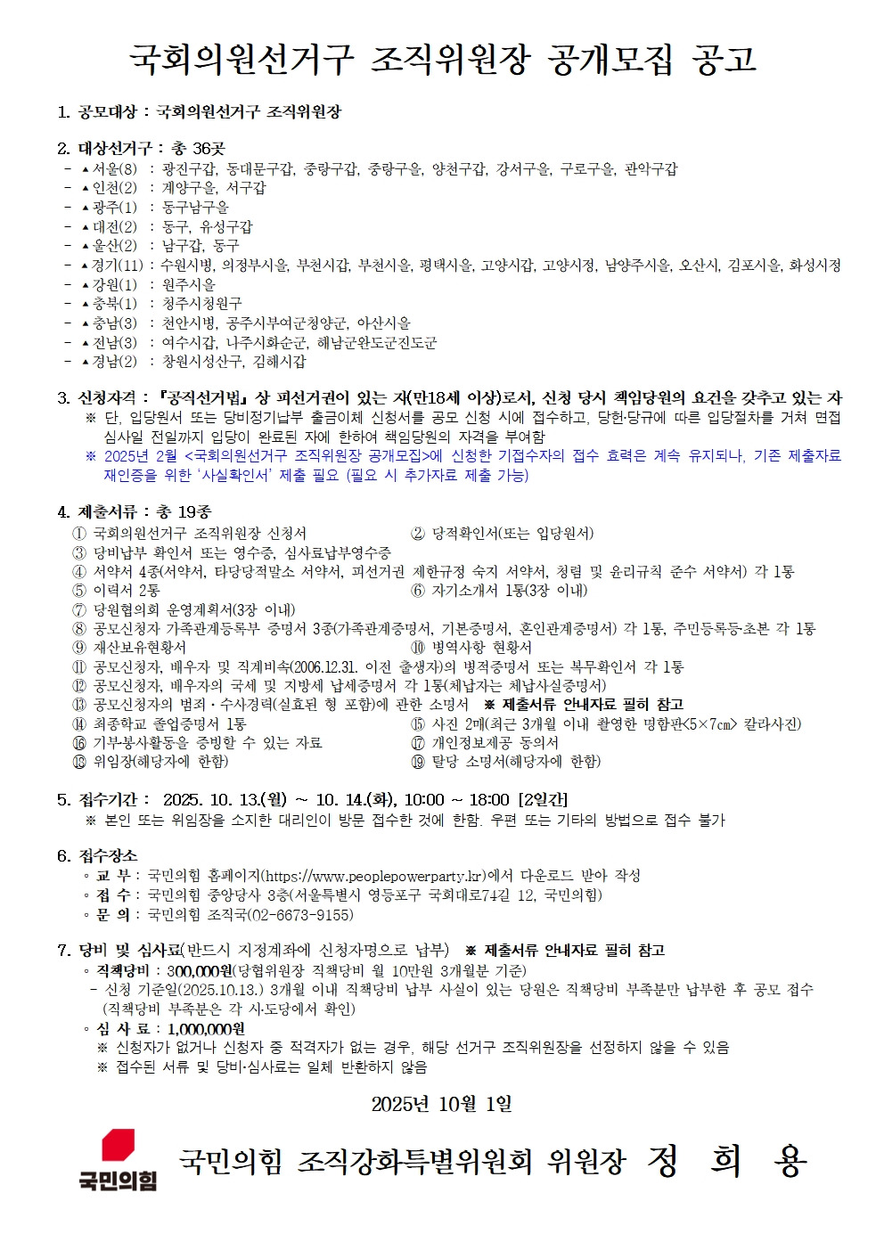 국회의원선거구 조직위원장 공개모집 작성자국민의힘광주광역시당|작성시간25.10.01|조회수56 목록 댓글 0 글자크기 작게가 글자크기 크게가 [사실확인서] 2025 국회의원선거구 조직위원장 공개모집 신청(기접수자용).hwp52.50KB[서식] 2025 국회의원선거구 조직위원장 공개모집 신청.hwp286.00KB[안내자료] 국회의원선거구 조직위원장 공개모집 신청 제출서류 안내(수정).hwp94.00KB 첨부파일첨부된 파일이 4개 있습니다. jpg 파일 공고.jpg 다운로드 hwp 파일 [사실확인서] 2025 국회의원선거구 조직위원장 공개모집 신청(기접수자용).hwp 다운로드 hwp 파일 [서식] 2025 국회의원선거구 조직위원장 공개모집 신청.hwp 다운로드 hwp 파일 [안내자료] 국회의원선거구 조직위원장 공개모집 신청 제출서류 안내(수정).hwp 다운로드 다음검색 현재 게시글 추가 기능 열기 북마크 공유하기 신고 센터로 신고 댓글 댓글 0 댓글쓰기 답글쓰기 댓글 리스트