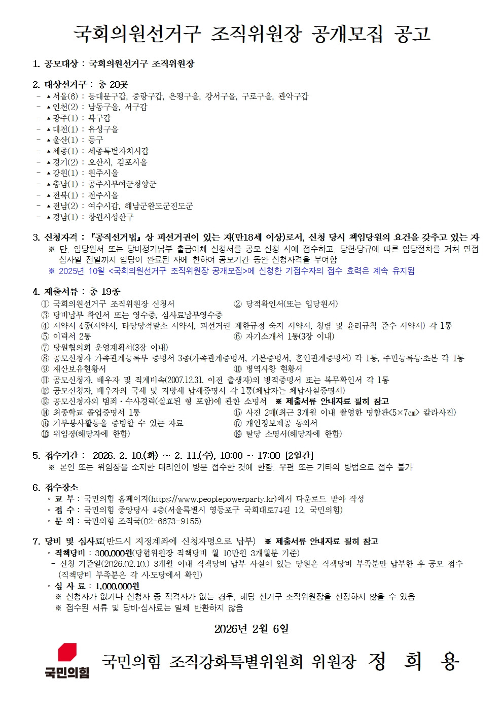 국회의원선거구 조직위원장 공개모집(광주 북구갑) 작성자국민의힘광주광역시당|작성시간26.02.06|조회수44 목록 댓글 0 글자크기 작게가 글자크기 크게가 [안내자료] 2026 국회의원선거구 조직위원장 공개모집 신청 제출서류 안내 (수정).hwp94.00KB[서식] 2026 국회의원선거구 조직위원장 공개모집 신청.hwp286.00KB 첨부파일첨부된 파일이 3개 있습니다. jpg 파일 586b686e130b71bd80fa46622b4914de.jpg 다운로드 hwp 파일 [안내자료] 2026 국회의원선거구 조직위원장 공개모집 신청 제출서류 안내 (수정).hwp 다운로드 hwp 파일 [서식] 2026 국회의원선거구 조직위원장 공개모집 신청.hwp 다운로드 다음검색 현재 게시글 추가 기능 열기 북마크 공유하기 신고 센터로 신고 댓글 댓글 0 댓글쓰기 답글쓰기 댓글 리스트