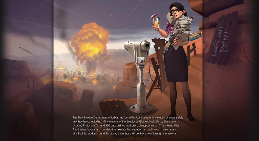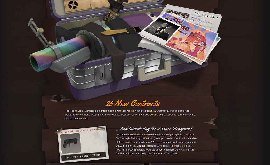 특정 무기 사용 계약을 마쳐야 한다는 규정이 없나요? 걱정 마세요! (진정하세요, 진심으로 드리는 말씀입니다.) Mann Co.의 다루기 힘든 총들을 위한 새로운 지역 봉사활동 프로그램, 대여 프로그램 덕분에, 이제 여러분은 계약 기간 동안 특정 무기를 빌릴 수 있습니다. 더블 동크에 도전해보세요! 여러분의 적에게 체온처럼 뜨뜻하고 신선한 병수도 한 병을 던져보세요! 백버너로 W+M1하러 가세요! 마치 여긴 도서관 같지만, 책 대신 살인마들의 장신구라는 게 다르죠!