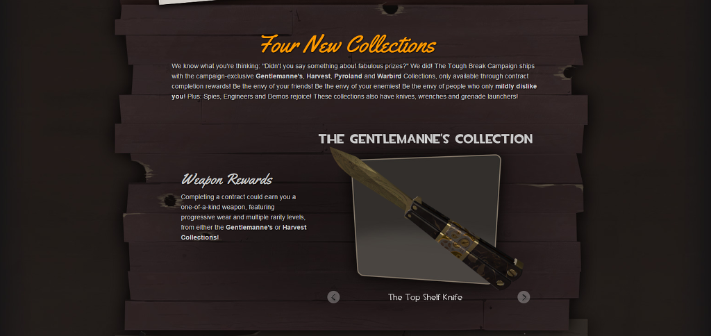 여러분이 무슨 생각하고 계시는지 압니다. "방금 당신들이 굉장한 보상 비스무리한 거 말하지 않았소?" 그랬죠! 불행한 휴가 작전은 오직 계약 완수 보상으로 얻을 수 있는 작전 독점의 Gentlemanne's Harvest, Pyroland, 그리고 Warbird 수집품과 함께 출시되었답니다. 친구들 사이에서 부러움의 대상이 되세요! 적들 사이에서 부러움의 대상이 되세요! 여러분을 대충 싫어하는 사람들 사이에서 부러움의 대상이 되세요! 추가적으로, 스파이와 엔지니어, 그리고 데모맨 유저들은 기뻐하세요! 이 수집품들은 또한 칼, 렌치 그리고 유탄 발사기의 장식된 무기를 가지고 있답니다!