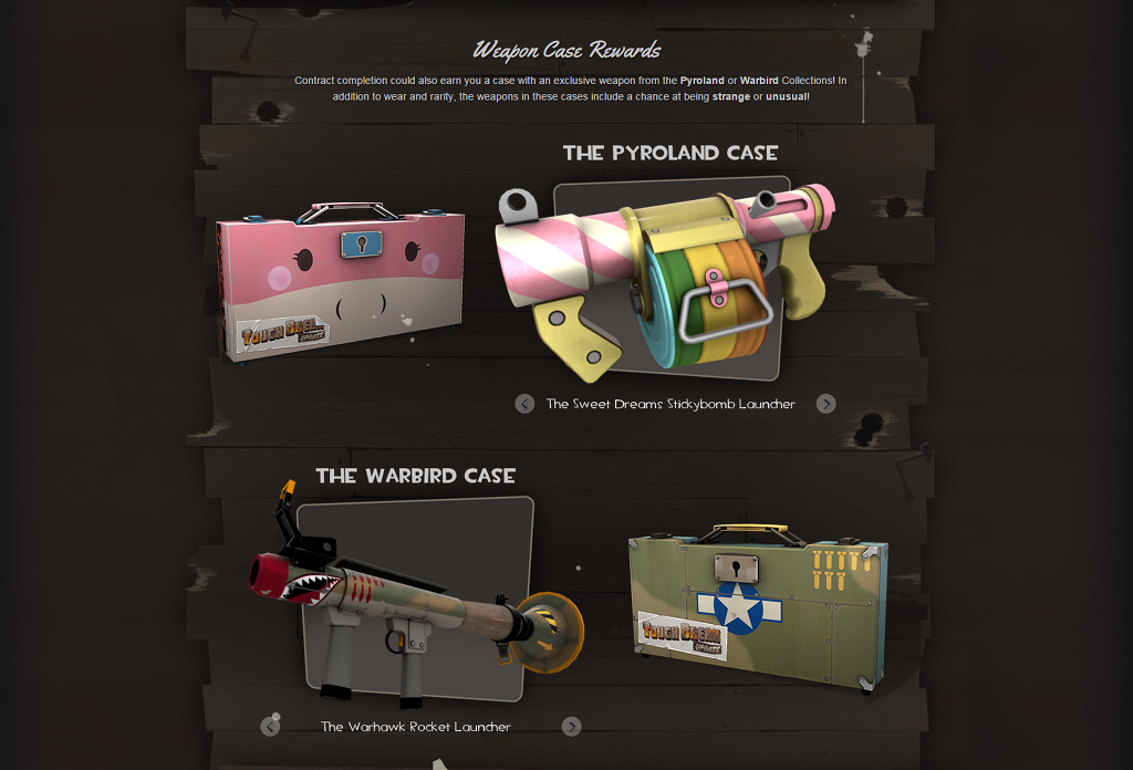 또한 계약 완수로 독점 무기가 들어있는 Pyroland나 Warbird 수집품 상자를 얻으실 수 있습니다! 외관과 희귀도에 더해서, 이 상자에 들어있는 무기는 이상하거나 범상찮을 확률을 가지고 있답니다!