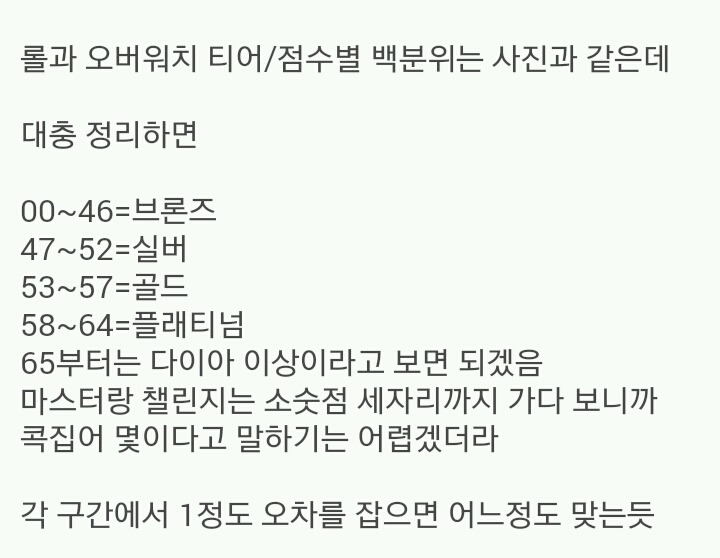 점수별 티어 백분위 작성자렉시|작성시간16.07.04|조회수1,211 목록 댓글 12 글자크기 작게가 글자크기 크게가 확실히 애들이 팀포를 좀 해서 그런지 평균적으로 낮진않네 출처 옵갤 다음검색 현재 게시글 추가 기능 열기 북마크 공유하기 신고 센터로 신고 댓글 댓글 12 댓글쓰기 답글쓰기 댓글 리스트 작성자wrath | 작성시간 16.07.04 몇주 지나야 물랭크 시발새기들 떨어질테니까 그때 좀 보여주면 좋겠다. 삭제된 댓글입니다. 답댓글 작성자하둡 | 작성시간 16.07.04 현실보소 ㅠ 작성자H O U N D | 작성시간 16.07.04 겨우 실버네....심해탈출 성공이다 작성자Shine | 작성시간 16.07.05 거품이 너무심해서 수치상은 맞지만 믿을만하진 않다 ㅠㅠ 댓글 전체보기