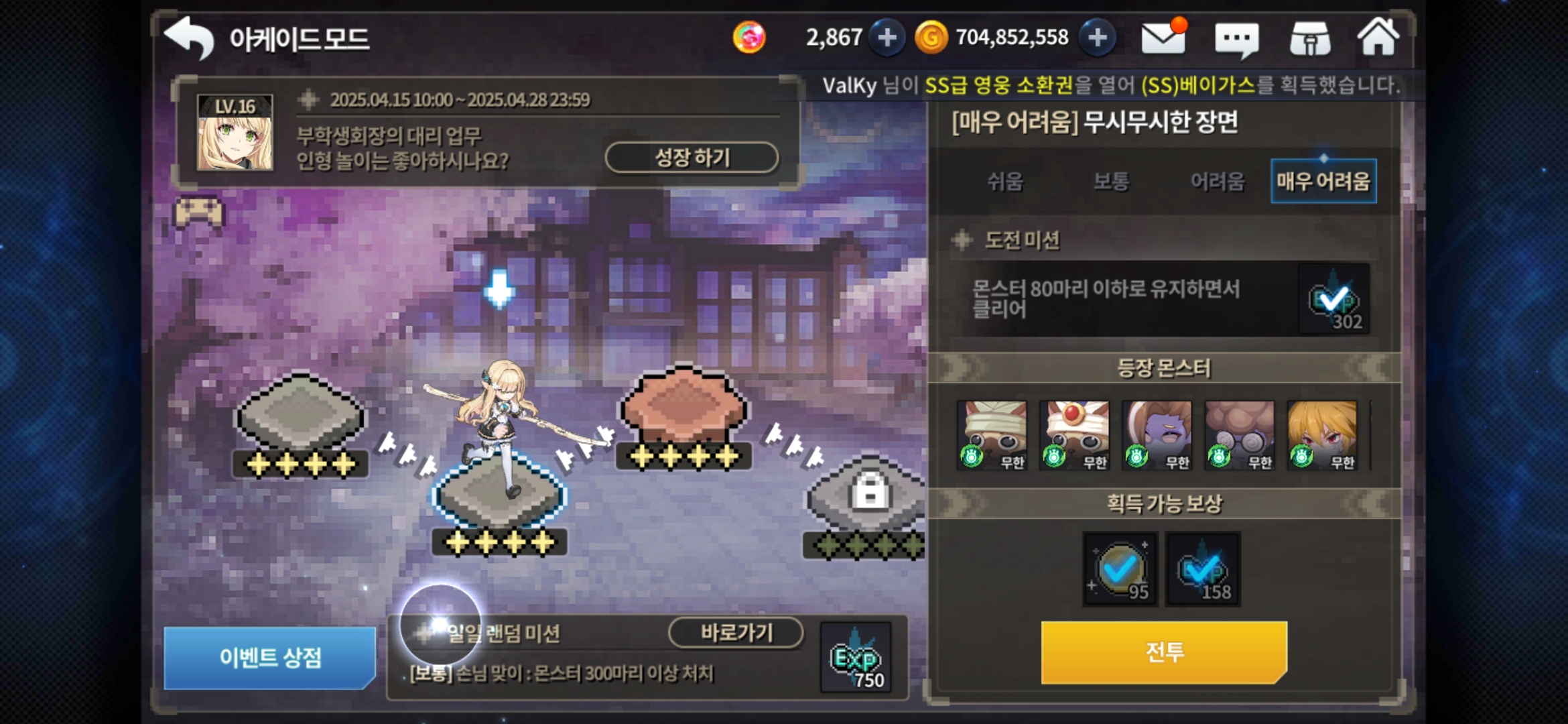 2분때 보스나오는데 대쉬 이용해서 하트 ❤️ 여기는 다돌아 다니면서 피회복하면서 메테오를 보스에게 맞춰서 타격으로 깨야함 라그나 지옥도 엘리 칼리 다해봣는데 메테오 리르 카나반 요게 가장 좋음