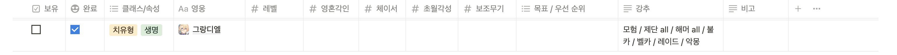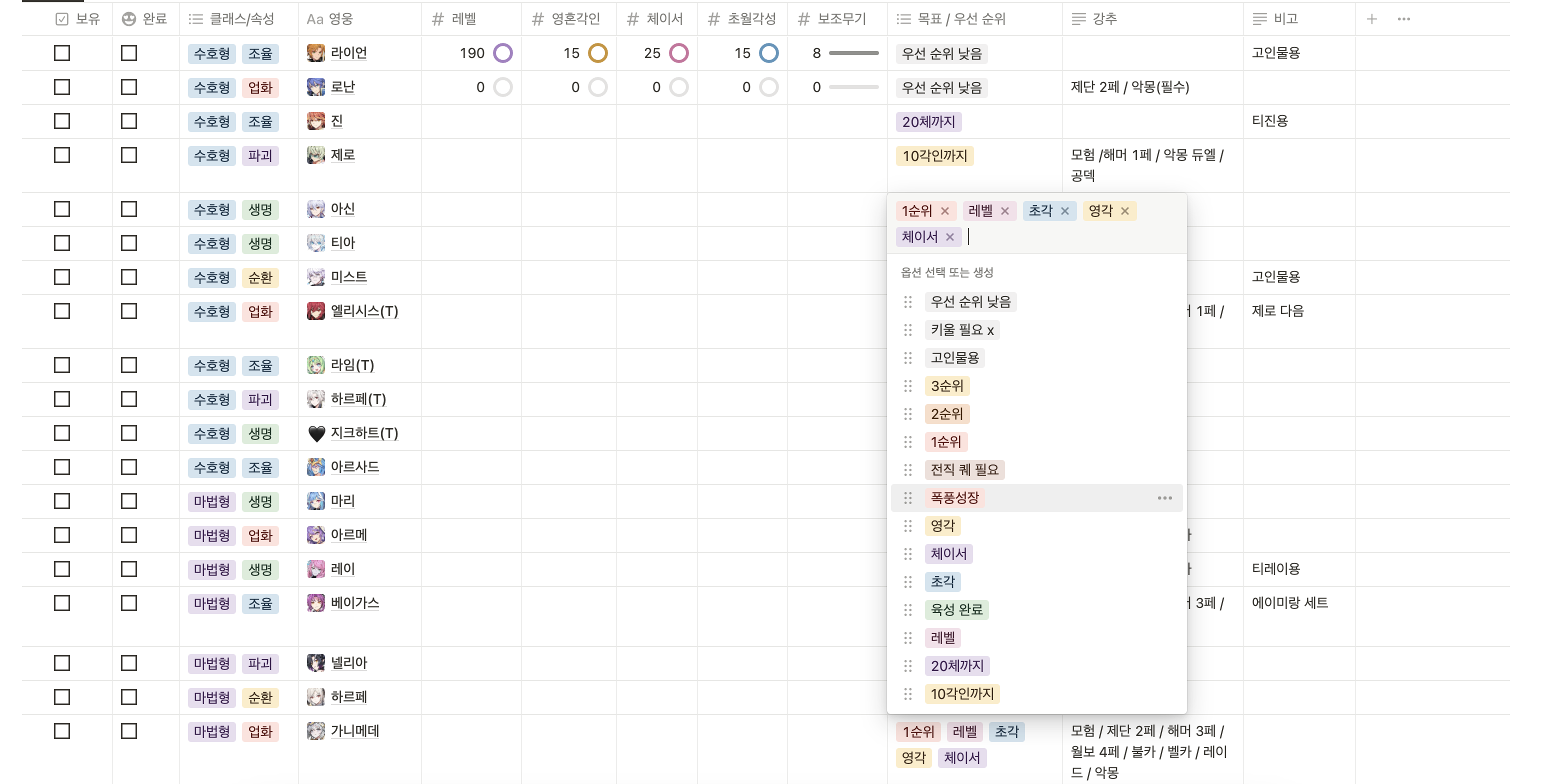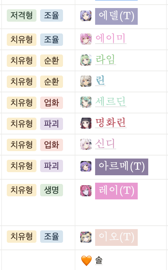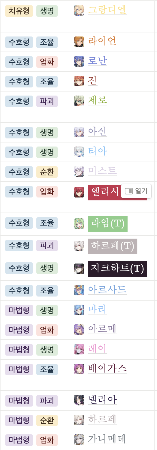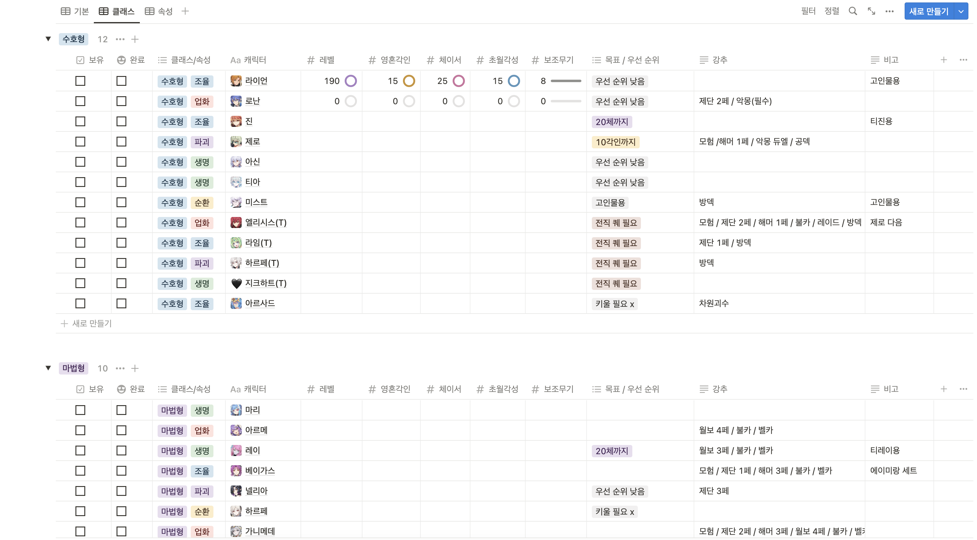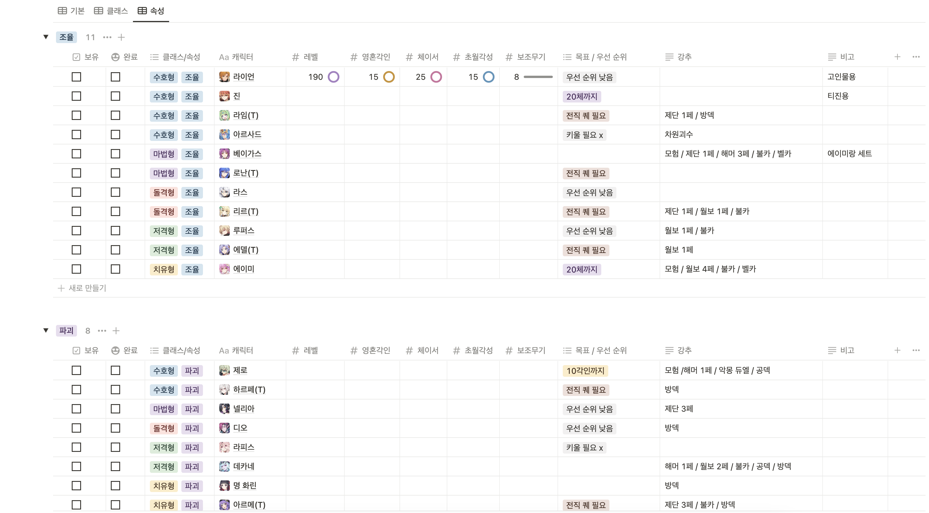 원래 표만 만들어두고 약식으로 적어서 사용했었는데 캐릭터 선택할 수 있도록 고쳐봤습니다...
