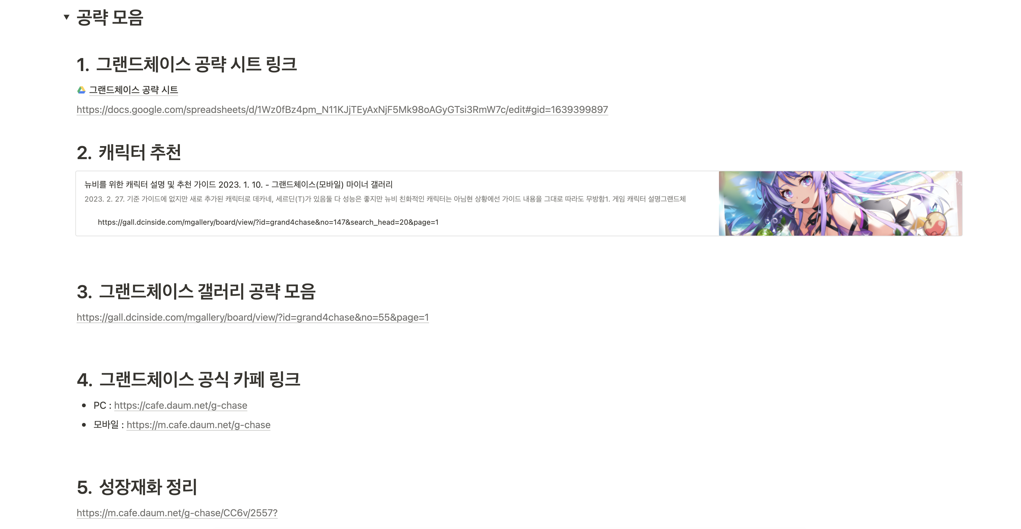 그리고 공략 모음을 펼치면 제가 주로 검색하거나 정보 얻는 곳들 링크 적어뒀습니다