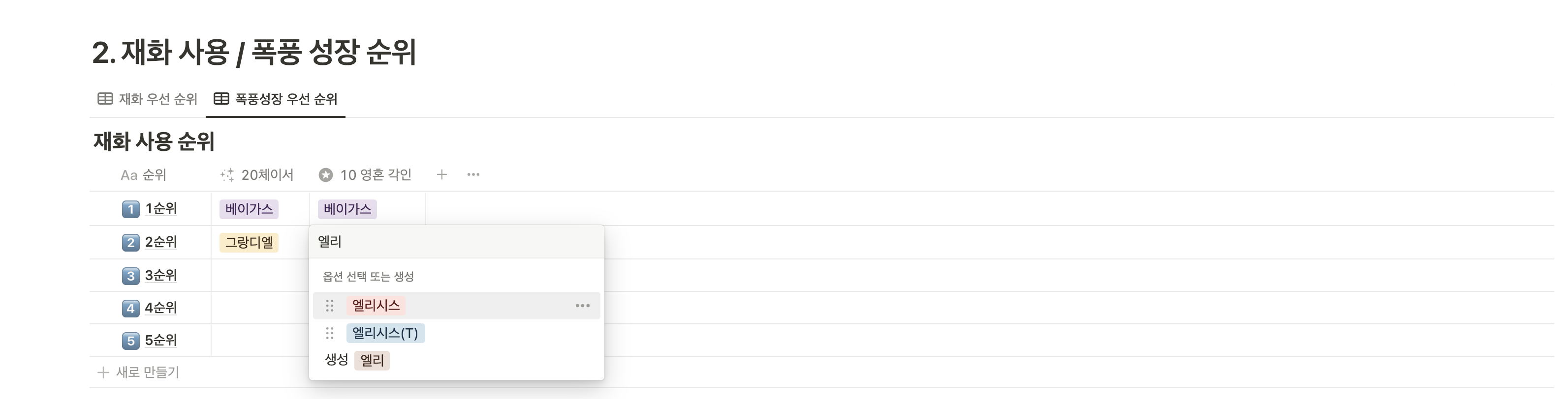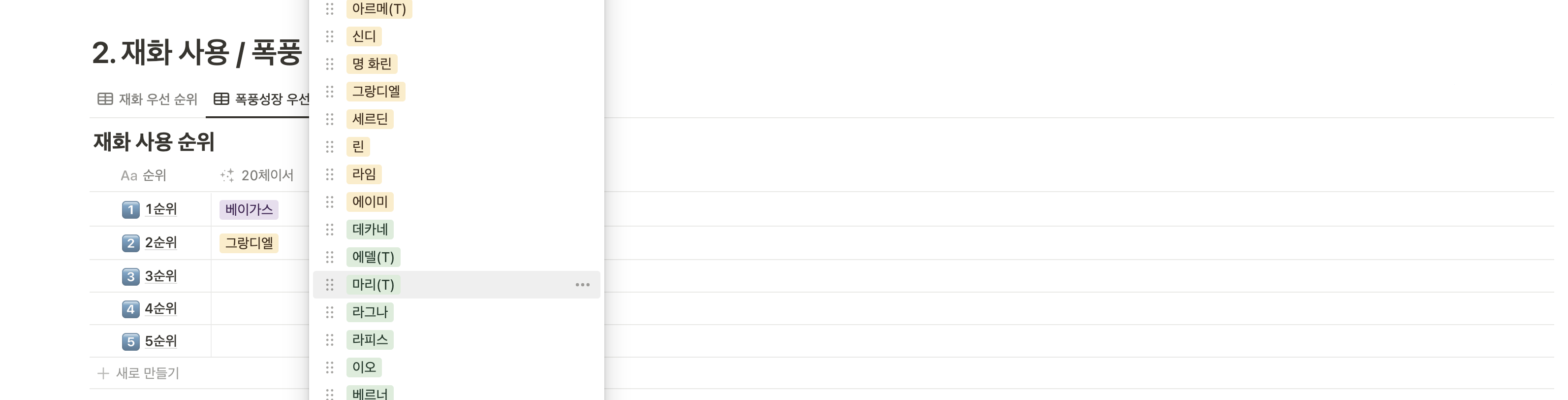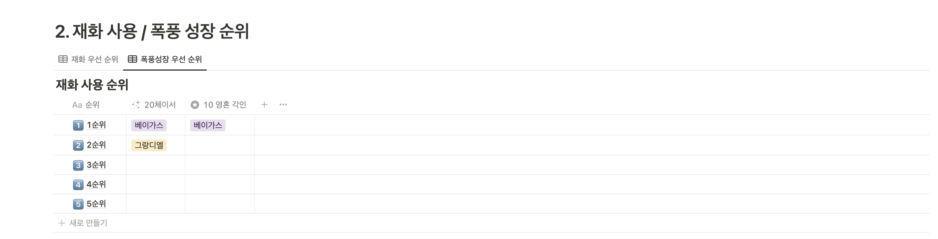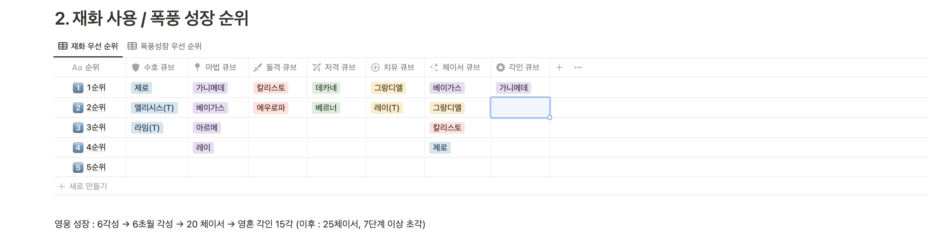 그리고 두 번째 표는 재화사용/폭풍 성장 우선 순위 입니다.