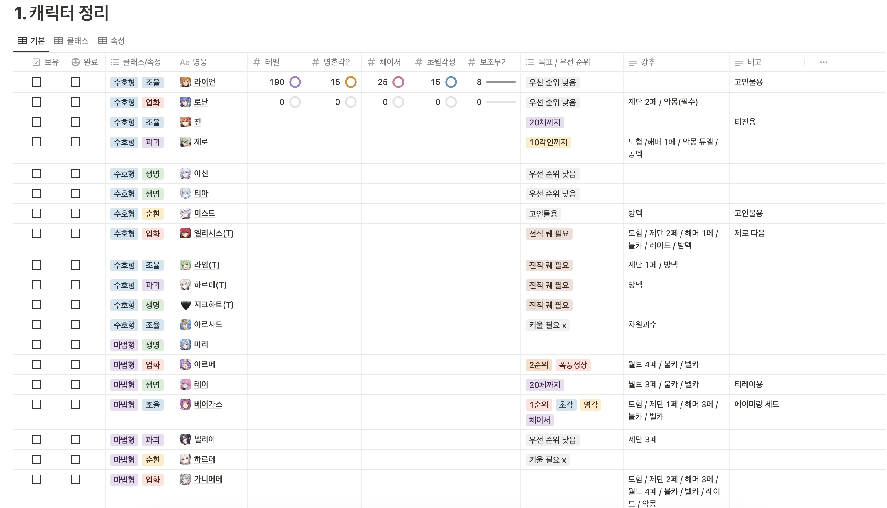 아직 캐릭터가 많지 않으시다면, 강추 항목이 많은 캐릭터부터 키우면 좋을 것 같아요!