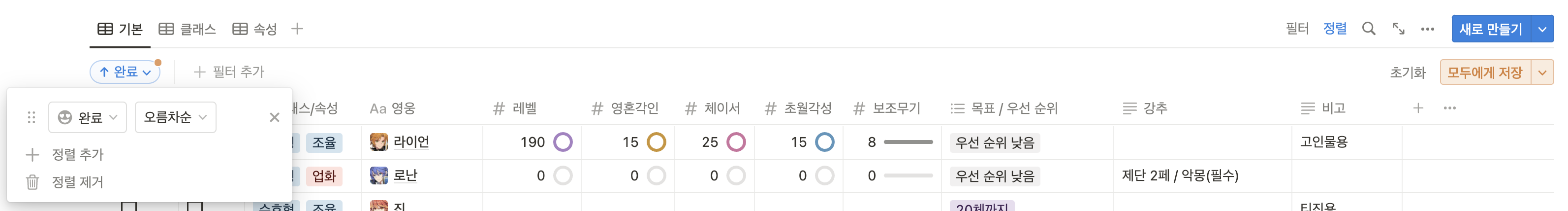 그리고 완료 체크한 캐릭터는 제일 아래 가도록 설정해뒀는데