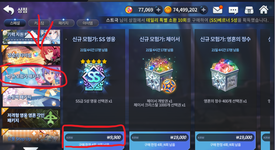 신규모험 패키지가 있습니다 저기서 9,900원짜리 선택권을 구매해줍니다
