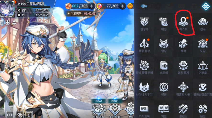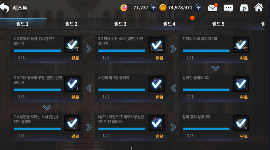 메인화면 오른쪽상단 메뉴를 누르시고 퀘스트에 들어가시면 이렇게 월드별로 미션이 뜹니다