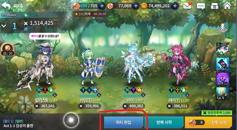 모험 들어가셔서 1지역 1-1에 들어가시고 파티편집 눌러주세요