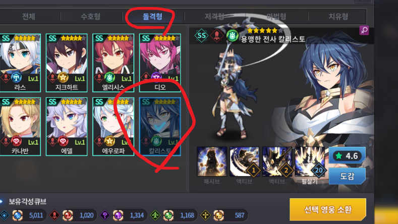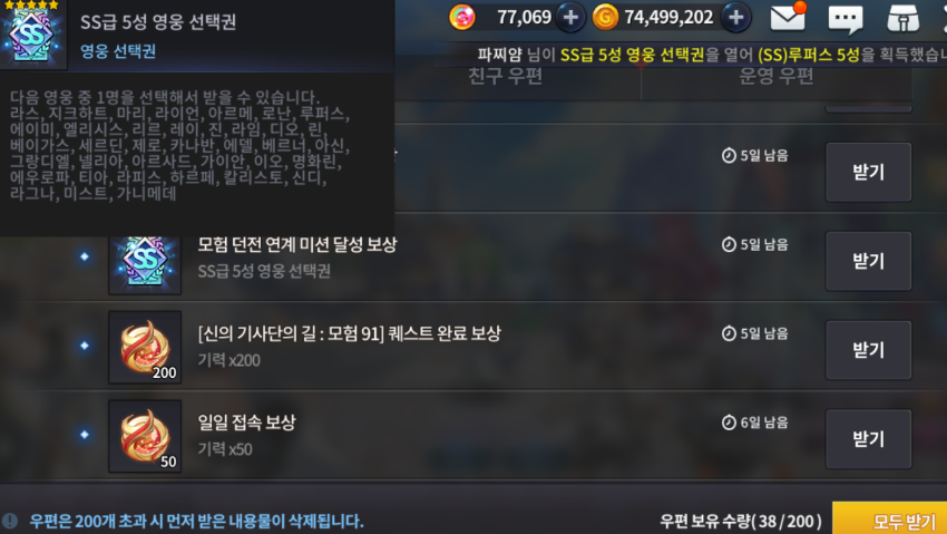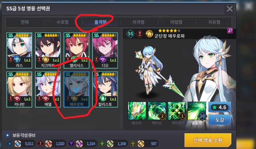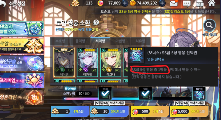 좌측처럼 간략하게 SS5성 영웅중 1명이라고 기재되있는건 신캐 포함 모~~든 SS등급 영웅이 나오는 선택권이고