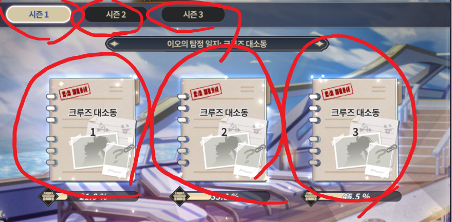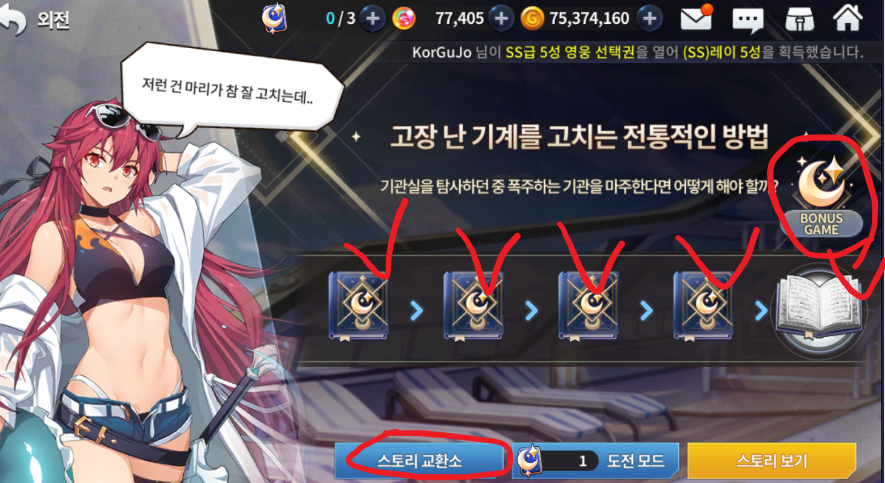 왼쪽부터 스토리 보기로 클리어를 하시면 각각 재화를 얻고, 보너스게임까지 깨주시면 됩니다