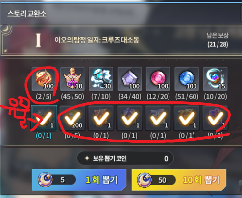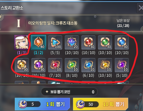 이렇게 구성되어 있는데 각 스토리마다 구성품은 같으나 낮은 확률로 나오는 2개의 구성품은 다릅니다
